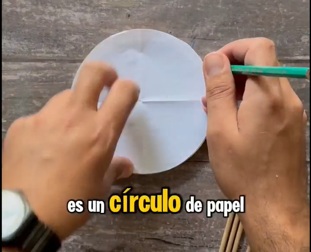 3.- Con un círculo de papel, nos ayudamos a marcar los puntos en donde queremos poner las varillas de madera, para que quede a la misma distancia unas de otras.