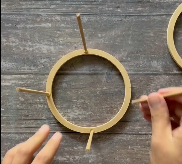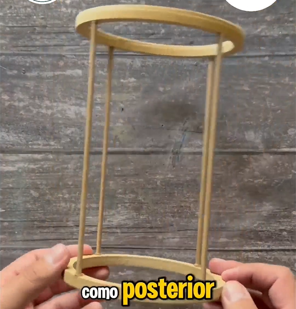 4.- Con la Pistola Hot Melt de Suprabond, vamos a armar la estructura, pegando las varillas a los aros de madera; tanto en la parte inferior como en la parte superior.