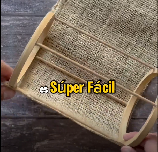 2.- En este caso utilizamos arpillera y varillas de madera. Un TIP espectacular: “pintamos” la arpillera con agua y un poco de laca para que se endurezca un poco.