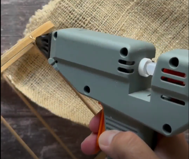 5.- Recortamos el rectángulo de arpillera según la medida que elijas, y con la Pistola Hot Melt vamos a ir pegando las varillas a la arpillera, de a poquito y por segmentos ponemos el adhesivo en el aro, para facilitar todo el armado; hasta completar toda la vuelta.