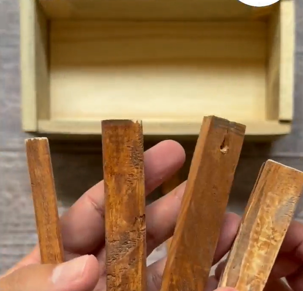 3.- Los listones cuadrados vamos a pegarlos en cada vértice exterior de la caja, y los listones circulares, los vamos a utilizar en los extremos de la caja para que funcionen como manijas.