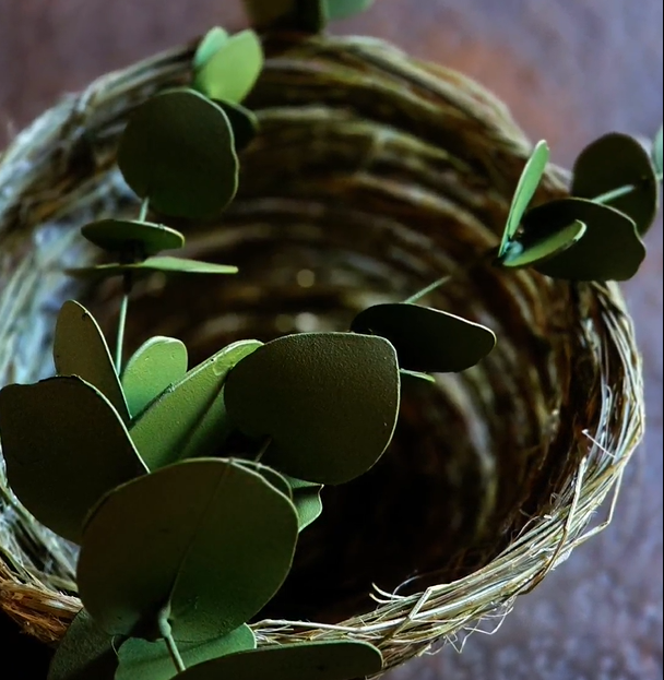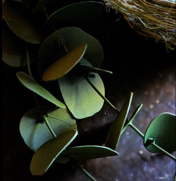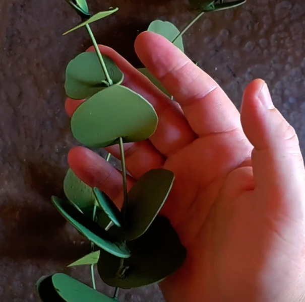 4.- En cada hojita, tenés que volver a agarrar la Pistola, y le vas a poner un puntito de adhesivo para acomodarlas en el ángulo que más te guste. IMPORTANTE: Fijate que siempre respetes estas ramitas de eucalipto así son más fieles a la realidad.