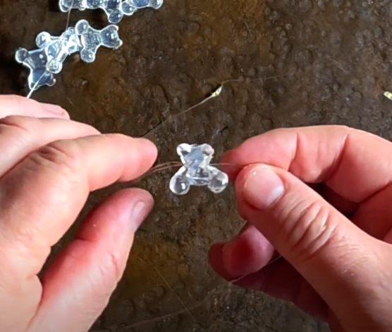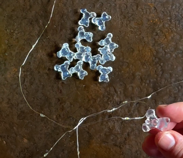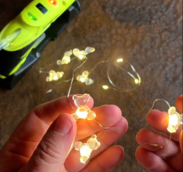 ¿Cómo lo hacemos? Con la misma Pistola Encoladora, vamos a ir pegándolos a las luces para armar una guirnalda de ositos.