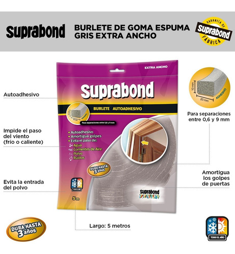 Burlete autoadhesivo. Dura hasta 3 años. Permite hermetizar (sin herramientas), puertas y ventanas en forma rápida y económica. Impide el paso del viento (frío o caliente), así como también la entrada de polvo.