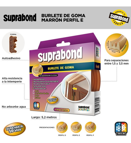 Nuevo material EPDM. Los burletes de goma Suprabond están fabricados con caucho EPDM, lo que les otorga un gran poder de absorción de golpes, máxima resistencia a la intemperie y gran durabilidad.
