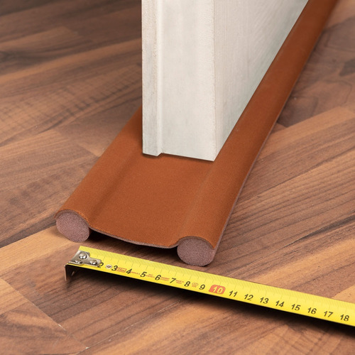 Deslizar el zócalo por debajo de la hoja de la puerta con la parte descubierta de los rollos hacia abajo, de manera que quede uno de los rollos a cada lado de la puerta.
