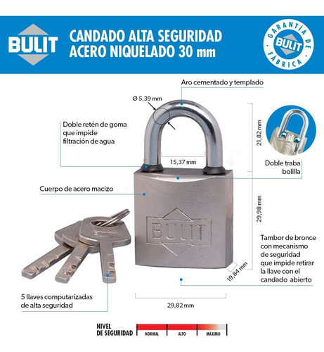 Candado de alta seguridad de acero niquelado con mecanismo de seguridad que impide retirar la llave con el candado abierto.