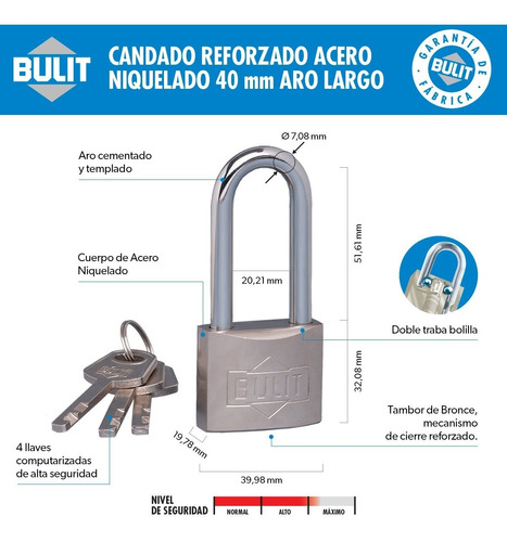 Candado reforzado de acero niquelado aro largo – 40 mm