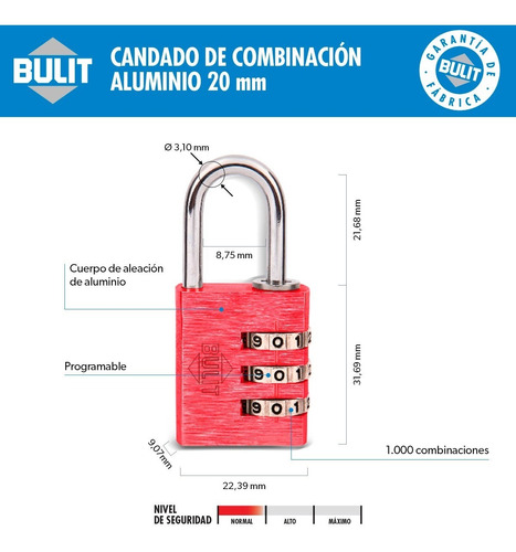 Candado de aleación de aluminio rojo – 3 combinaciones – 20 mm