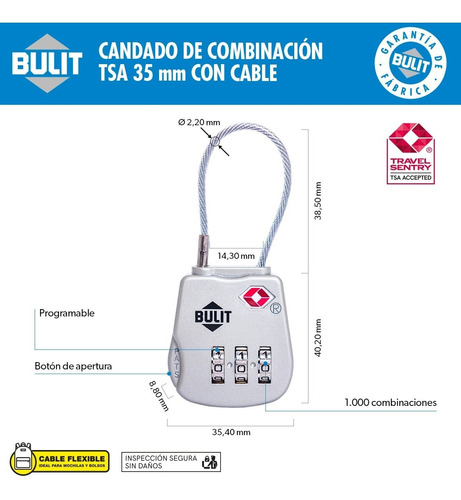 Los Candados TSA BULIT están aprobados y homologados por la Agencia de Seguridad en el Transporte (TSA) de Estados Unidos. Permite a las autoridades de seguridad aeroportuaria abrir e inspeccionar el equipaje con una llave maestra sin dañarlo.