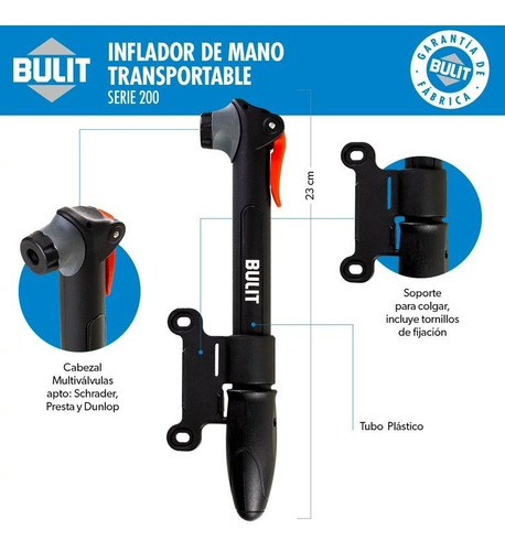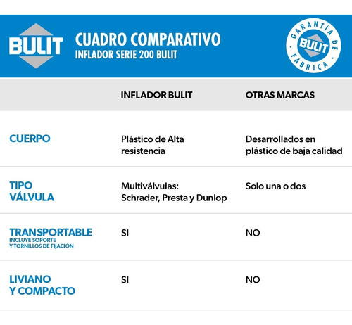 Liviano y compacto. Apto para válvulas Schrader, Presta y Dunlop. Incluye soporte y tornillos de fijación.