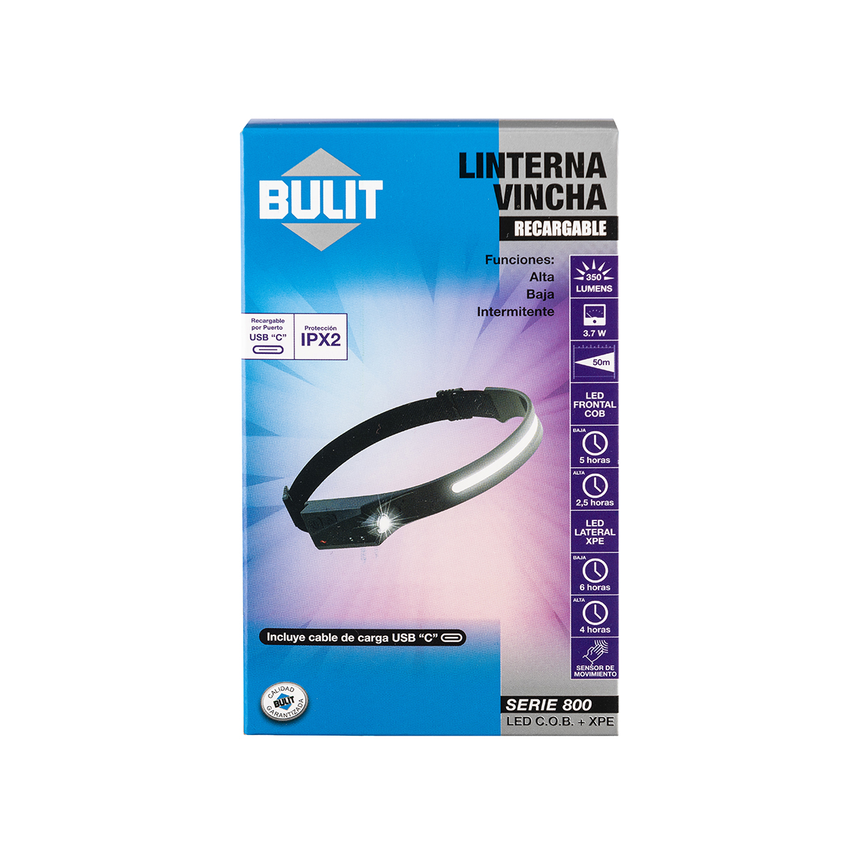 La Linterna Vincha Recargable Serie 800 BULIT cuenta con una potencia luminosa de 350 Lumens y 3.7 W. El haz de luz posee un alcance de 50 metros. Posee batería recargable e incluye cable USB para su carga