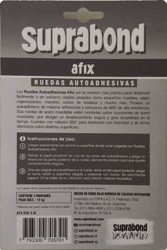 Una vez pegado el autoadhesivo a la rueda, retirar el otro papel protector, pegar la rueda sobre la superficie elegida y presionar con fuerza. Se recomienda esperar 24 hs antes de su utilización para obtener mejores resultados.
