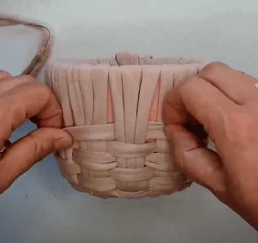 4.- Ahora hay que ir “tejiendo” la totora en el sentido opuesto al anterior. Vamos a ir pasando 3 líneas por arriba, 3 líneas por abajo, y así ir armando un hermoso tejido en toda la circunferencia del contenedor.