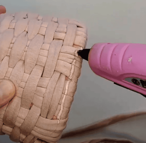 2.- Una vez que la pintura está seca, vas a tomar la medida del alto del contenedor, para poder pegar la totora, dejándole un extra arriba, y un extra abajo.