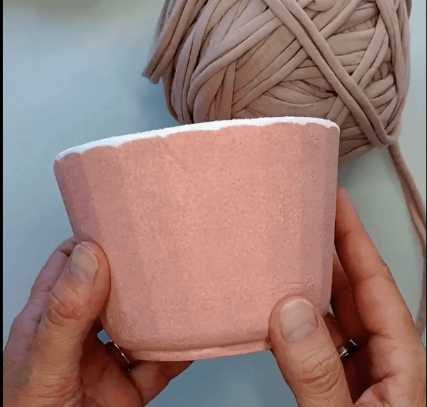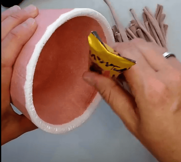 2.- Una vez que la pintura está seca, vas a tomar la medida del alto del contenedor, para poder pegar la totora, dejándole un extra arriba, y un extra abajo.