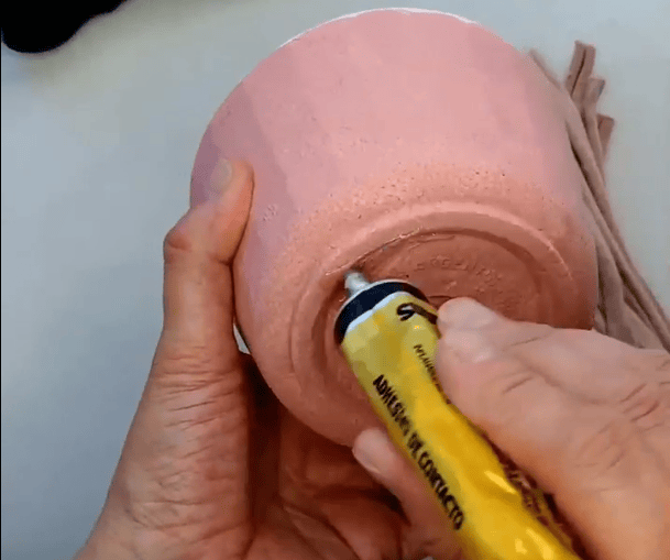3.- En la parte superior interna del pote y en su base, le agregamos Suprabond Transparente EXTRA FUERTE para poder pegar la totora, e ir colocando pedacito a pedacito hasta cubrir la totalidad del pote.