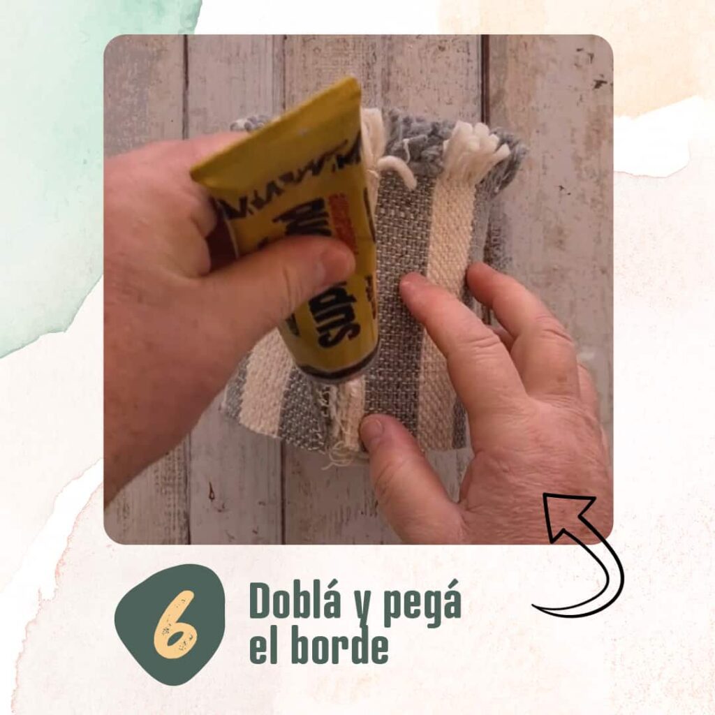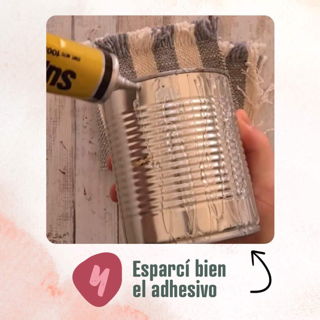 5 – Apoyá el trapo en la lata hasta que se impregne bien el adhesivo y retiralo. Dejá orear 3 minutos y pegalo ahora sí cubriendo toda la lata. Los flecos te tienen que quedar en la parte superior.