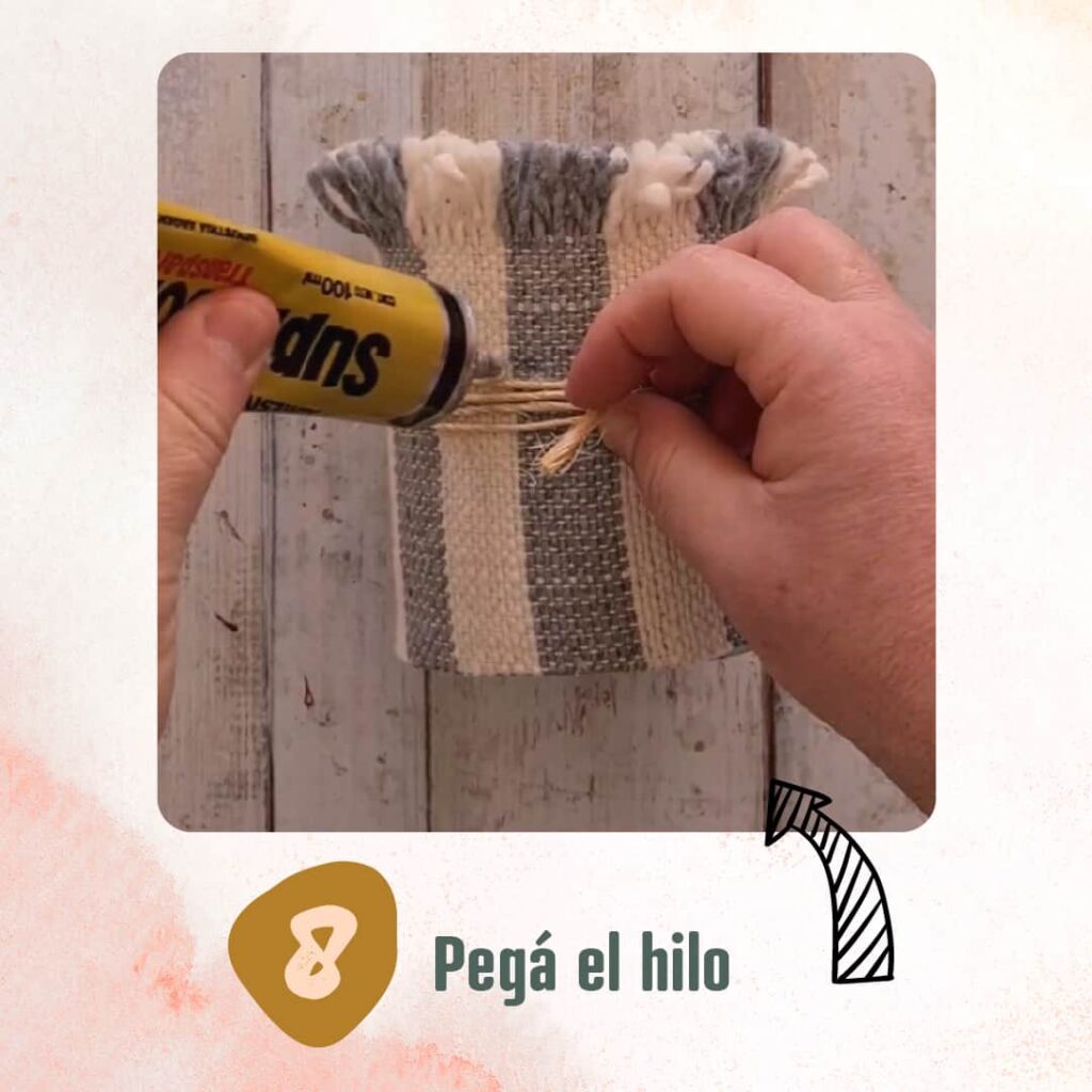 7 – Cortá una tira de hilo de yute o cinta y dale unas vueltas para decorar.