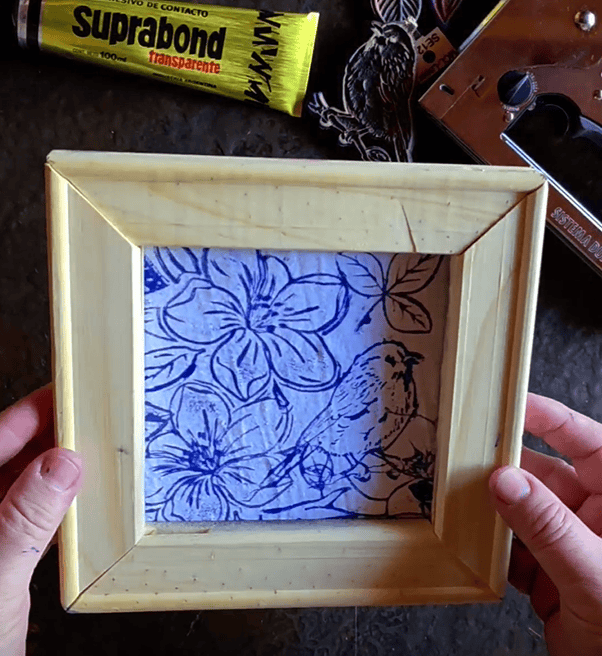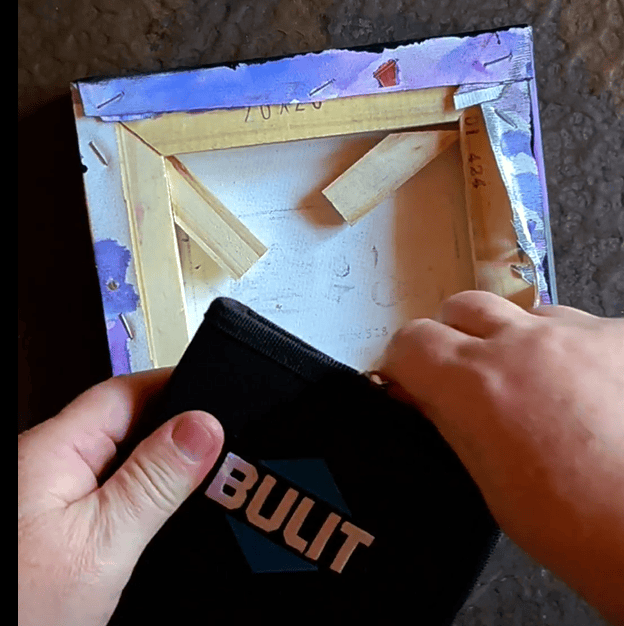 5.- Recortamos los excedentes de la tela, y vamos a armar el cuadro, junto a la engrampadora dúo de BULIT.