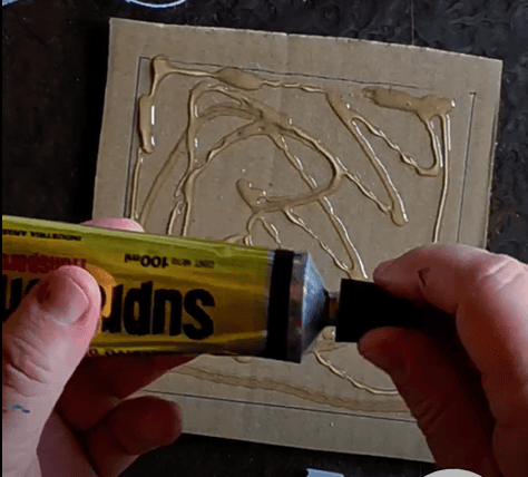 4.- Cortamos un cartón con la medida del bastidor, le ponemos un poco de Suprabond transparente Extra Fuerte, “pintándolo” con la espátula que viene en el pack; y pegamos la tela con el diseño realizado.