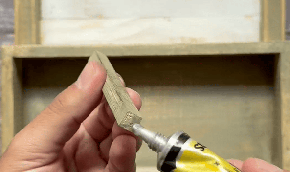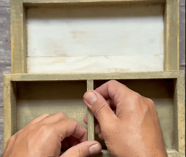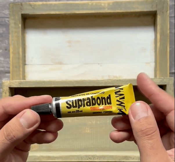 2.- Con el adhesivo Suprabond Transparente EXTRA FUERTE, pegamos una maderita chiquita para lograr un separador dentro del cajoncito más pequeño.